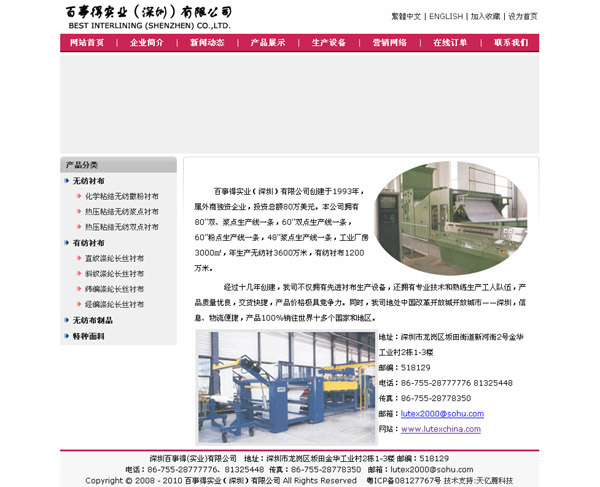 本公司擁有80"雙、漿點生產線一條,60"雙點生產線一條,60"粉點生產線一條,48"漿點生產線一條,財產廠房3000㎡,年生產無紡襯3600萬米,有紡襯布1200萬米。 顛末十幾年創建,我司不但擁有先輩襯布生產裝備,還擁有專業技能和熟練生產工人步隊,產物格量良好,交貨快捷,產物代價極具競爭力。同時,我司地處中國改造開放城開放都市——深圳,信息、物流便捷,產物100%銷往天下十多個國度和地域。