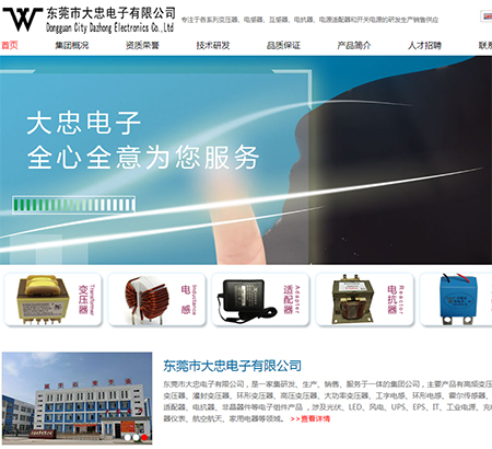 電子變壓器、電感器、電源適配器網站建設公司,做網站優化關鍵詞排名SEO,營銷型,手機網站建設,響應式,品牌型,電商/門戶,電子變壓器、電感器、電源適配器外貿型網站建設. 東莞市大忠電子有限公司是一家集研發、生產、銷售為一體的專業電子變壓器、電感器、電源適配器制造廠商。