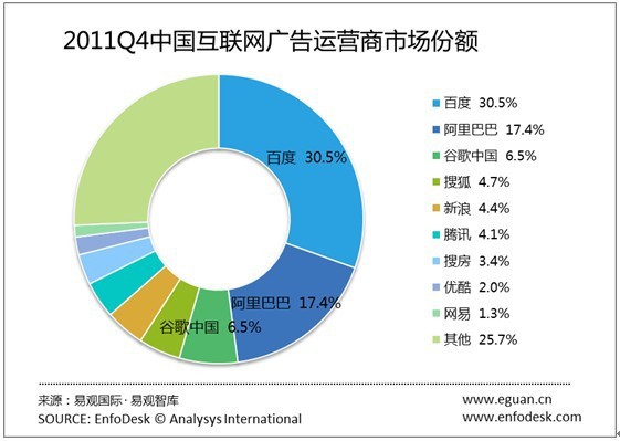 【TechWeb報道】一月三十一日信息息,EnfoDesk易觀智庫產業數據庫發布的《2011年第4季度中國網絡廣告市場季度監測》數據顯示,百度、阿里巴巴、谷歌中國位居前三,百度占到中國互聯網廣告市場份額的百分之三十,阿里巴巴占到17.4%,谷歌中國占到6.5%。百度:30.5%,阿里巴巴:17.4% ,谷歌中國:6.5%,新浪(不包含新浪樂居業務)4.7%、搜狐:4.7%、騰訊4.1%、網易1.3%,搜房3.4%、優酷2.0%,其他:25.7%