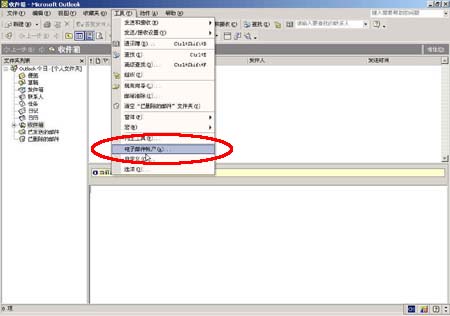 2.從菜單中選擇"工具/帳號"菜單項,打開"電子郵件帳號"窗口;